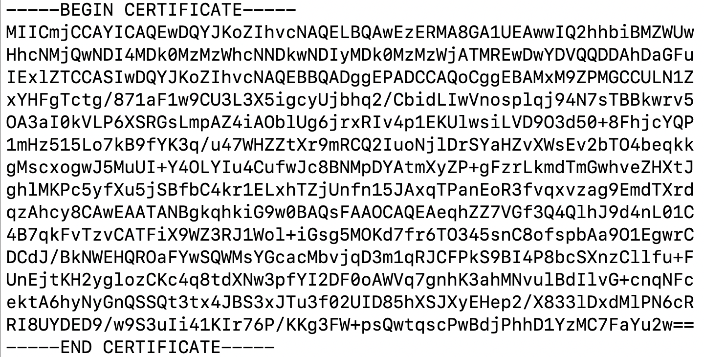 이렇게 추출한 인증서를 cat 명령어를 통해 뽑아보면, Keystore로 부터 인증서가 잘 추출된 것을 확인할 수 있다: